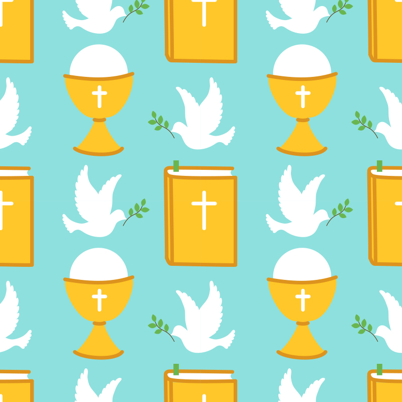 All over the world, thousands of kids prepare for their First Holy Communion. Generally, children receive their first Eucharist around the age of seven. This creates a need for surface pattern designs on: scrapbook papers, announcements, invitations, gift products, masks, boys ties/socks, and girls dresses.